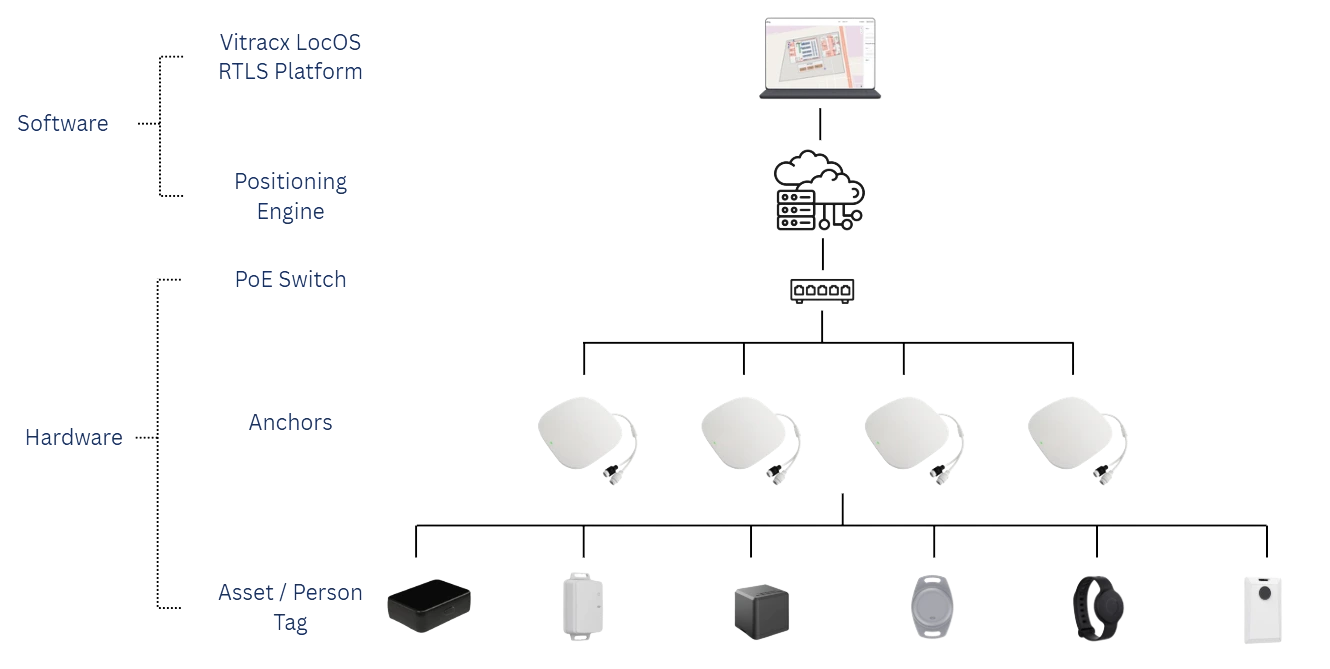Vitracx LocOS uses advanced real-time location algorithms to track assets, inventory, products, and people with high accuracy.